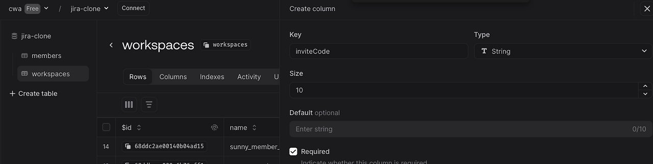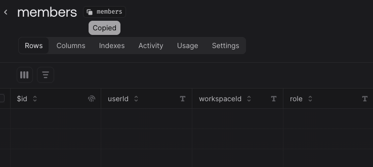 Appwrite에서 members 테이블을 생성하고 다음 컬럼들을 추가