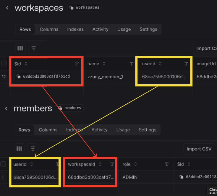 workspaces목록의 workspacesId와 userId가 members의 column과 동일함