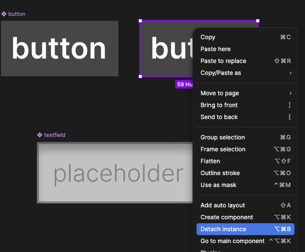 - 기존 컴포넌트를 변형해 새로운 버전을 만들고 싶다면, Instance를 복사한 뒤 Detach Instance를 클릭한다.