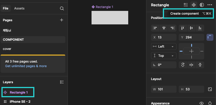 - 요소를 만든 후 Create Component를 클릭하면 해당 레이어가 컴포넌트로 변환된다.
